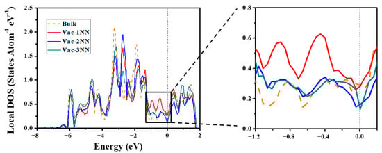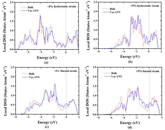 Figure 3 shows the LDOSs projected on the 5d orbitals of a bulk W atom and the 1NN W atom surrounding the monovacancy in strained W. Under hydrostatic strain (Figure 3a,b), the energy width of the 5d electrons increases under compressive strain, but decreases under tensile strain, which is consistent with the previous study [56]. Interestingly, the vacancy-induced peaks at the pseudogap near the Fermi level for 1NN W atom almost disappear under compressive strain (−5%) (Figure 3a). Therefore, the electronic states’ distribution near the pseudogap of 1NN W atom is almost the same as that of W atom in the bulk system, leading to the significant reduction of the formation energy of a monovacancy. On the contrary, Figure 3b shows that the strain-induced peaks at the pseudogap for the 1NN W become more significant under 5% tensile strain, in comparison with that of the strain-free case. Hence, the formation energy of a monovacancy is increased under tensile strain. Similar results are also observed under biaxial strain, as demonstrated in Figure 3c,d. Moreover, the LDOSs variation of 1NN W atom induced by hydrostatic strain is much larger than that induced by biaxial strain, which is also consistent with the strain-induced variation of vacancy formation energy (see Figure 1). Consequently, these results suggest that the applied strain can significantly affect the electronic states of W atoms nearby, and thus the formation energy of a monovacancy in W.