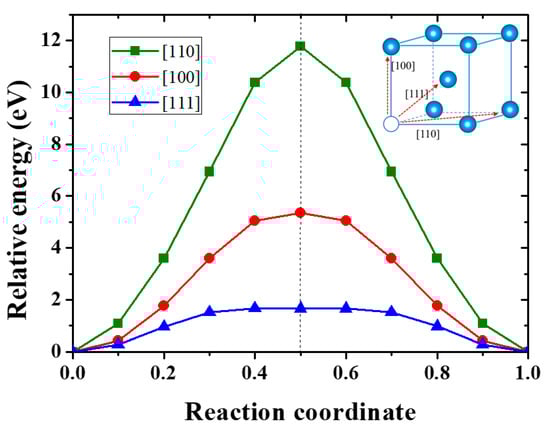 The mobility of vacancy in materials plays a crucial role on the vacancy evolution and is mainly controlled by the migration energy, which is the energy difference between the transition and ground states. There are three potential migrating directions for a monovacancy in bcc W, that is, < 111 >, < 100 >, and < 110 > directions, and the saddle point lies in the halfway of the migration path for all cases. As shown in Figure 4, the migration energies of a monovacancy in strain-free W along [111], [100] and [110] directions are 1.64 eV, 5.34 eV, and 11.77 eV, respectively. This suggests that the migration along < 111 > direction is the optimal migration path for a monovacancy in W, in agreement with previous results [23,24,25]. As the different paths have the same ground state, the difference of their energy barriers originates from the different structure of transition states. It is found that the interatomic distances between the migratory-W (Mig-W) atom and its 1NN W atoms in transition states are 2.68 Å, 2.47 Å, and 2.22 Å along < 111 >, < 100 >, and < 110 > directions, respectively. These values are much shorter than the equilibrium distance between W atoms (2.75 Å) in perfect lattice. Therefore, the smaller the W-W distance, the larger the lattice distortion in transition states and the higher the migration energy.
