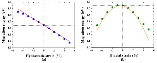 Obviously, the integration of a liner function results in a quadratic function, corresponding to the parabolic dependence of vacancy migration energy on biaxial strain. Indeed, as displayed in Figure 5b, there is a good agreement between the elastic dipole tensor prediction by Equation (7) (solid line) and the DFT calculation (data points).