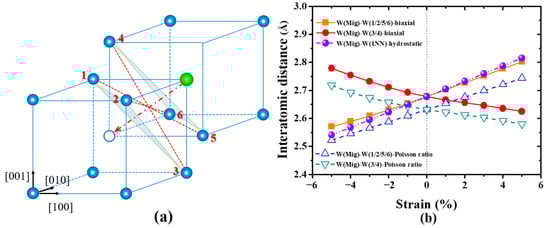 As shown in Figure 6b, the slope of the curves predicted by the statistical approach is well consistent with that obtained by DFT calculations, confirming the critical role of the Poisson effect. Besides, it should be noted that the interatomic distance of the Mig-W-W pair in DFT calculations is slightly higher than that in our simplified statistical approach. This can be attributed to the strong repulsive interaction between Mig-W and its 1NN W atoms at the saddle point of vacancy migration, which leads to the increase of Mig-W-W distance (as the interatomic positions are relaxed spontaneously during DFT calculations) and is not considered in the statistical approach.