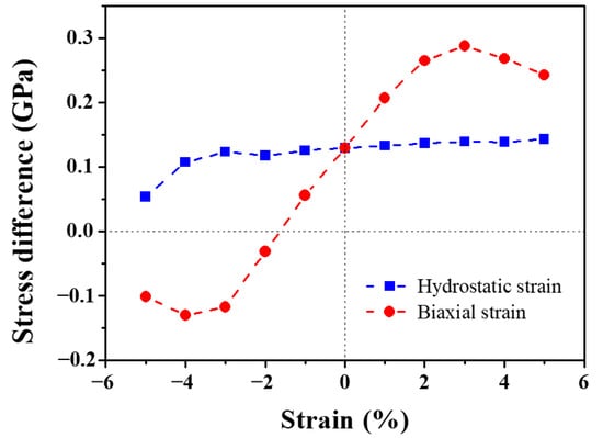 The stress difference between the transition and ground states along the strained direction for hydrostatically (blue dashed line) and biaxially (red dashed line) strained system.