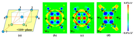 Figure 8 shows the differential charge density on the < 110 > plane, which is the close-packed plane in bcc W. The differential charge density is defined as the difference between the superposition densities of the monovacancy system plus a single W atom at the vacant site and the charge density of bulk W. The red region indicates accumulation of electrons after forming a monovacancy, while the blue region refers to depletion of electrons. Figure 8b shows that there is obvious electron accumulation (like a bond ring) between 1NN (e.g., W1) and 2NN (e.g., W5) W atoms. The accumulated electrons form a bonding cage surrounding the monovacancy, which causes more energy to be consumed to further break the metallic bonds in comparison with the perfect W. A similar phenomenon has also been reported in fcc Al [54]. Here, we refer to this enhanced bonding between 1NN–2NN W atoms as 1NN–2NN bonds. For the 1NN divacancy, seven extra bonds are broken for the formation of the second vacancy, as shown in Figure 9a, which is lower than that of a monovacancy (~8 extra bonds). However, three of them are the enhanced 1NN–2NN bonds, denoted as red double-sided arrow (Figure 9a). Moreover, it needs more energy to break these enhanced bonds than to break the four normal bonds. Accordingly, there is slight repulsion for the 1NN divacancy. As for the 2NN divacancy, eight bonds are broken for the formation of the second vacancy and four of them are enhanced 1NN–2NN bonds, as illustrated in Figure 9b. Thus, extra energy is needed to create the second vacancy, leading to the low binding energy of 2NN divacancy. Therefore, we mainly focus on the binding energy of the 1NN divacancy for the strained case, because it is more stable than the 2NN divacancy.
