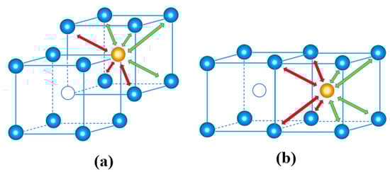 The positive value of suggests the lattice expansion during the Mig-W atom migrating from the ground state to the transition state. Thus, the extension of lattice under tensile strain balances the expanding tendency, decreasing the migration energy of a monovacancy, while the compressive strain leads to the increase of the migration energy. Indeed, as displayed in Figure 5a, there is a good agreement between the elastic dipole tensor prediction by Equation (6) (solid line) and the direct DFT calculation (data points).