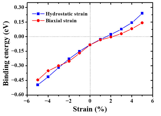 Figure 10 shows the variation of binding energy of 1NN divacancy under both hydrostatic and biaxial strain. It can be found that the binding energy of 1NN divacancy increases with the increasing of tensile strain, while it decreases with the increasing of compressive strain. This suggests that tensile strain facilitates the clustering of vacancies, but compressive strain suppresses it. Interestingly, the binding energy turns from negative to positive when the hydrostatic/biaxial tensile strain exceeds 1.5%/2%, respectively. This suggests that the 1NN divacancy is energetically stable under large hydrostatic/biaxial tensile strain.