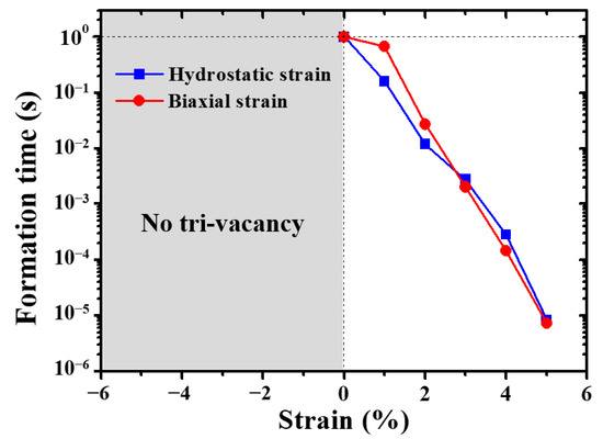 Figure 11 shows the formation time of tri-vacancy in W under different strain conditions. It is found that the tri-vacancy is observed under both hydrostatic/biaxial tensile strain. The formation time of the tri-vacancy significantly decreases with the increase of tensile strain. However, there is no tri-vacancy under hydrostatic/biaxial compressive strain. This can be attributed to the influence of strain on the mobility and clustering of vacancies in W. For the tensile strain cases, the migration energy of the monovacancy decreases with the increase of strain, enhancing the clustering of vacancies kinetically. Moreover, the binding energy of divacancy is positive under hydrostatic/biaxial tensile strains, except for strain of 1%. This suggests that, once a divacancy is formed, it is unlikely to dissociate. These two factors shorten the formation time of tri-vacancy with the increase of tensile strain, as illustrated in Figure 11. On the contrary, the mobility of the monovacancy is significantly reduced owing to the high migration energy under hydrostatic compressive strain. Therefore, the formation of the divacancy and tri-vacancy requires much more time. In addition, the binding energy of the divacancy is negative under hydrostatic compressive strain, indicating that the divacancy is energetically favorable to dissociate, thus inhibiting the formation of the tri-vacancy. Under biaxial compressive strain, the migration energy of the monovacancy is significantly reduced, corresponding to the high mobility of the monovacancy. However, the binding energy of the divacancy is negative, which indicates that, even though a divacancy is formed, it will soon dissociate before meeting another monovacancy. Therefore, the formation of the tri-vacancy is not observed in the whole simulation time scale under biaxial compressive strains. Consequently, the tensile strain will facilitate the nucleation of vacancies, while the compressive strain will suppress it. Note that, although tri-vacancy is not observed under in our OKMC simulation time scale owing to the negative binding energy, vacancy clusters could indeed be formed owing to the stabilizing effect of impurities (such as carbon and oxygen [32,33]), which is beyond the scope of this work.