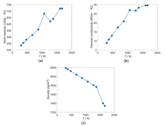 Thermophysical properties of Inconel 718 superalloy according to the increase in temperature T: (a) heat capacity; (b) thermal conductivity; (c) density [8].