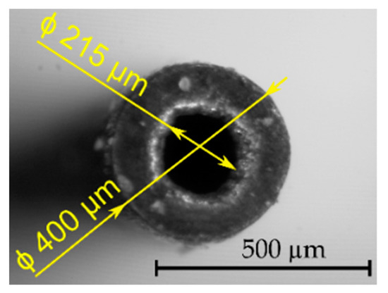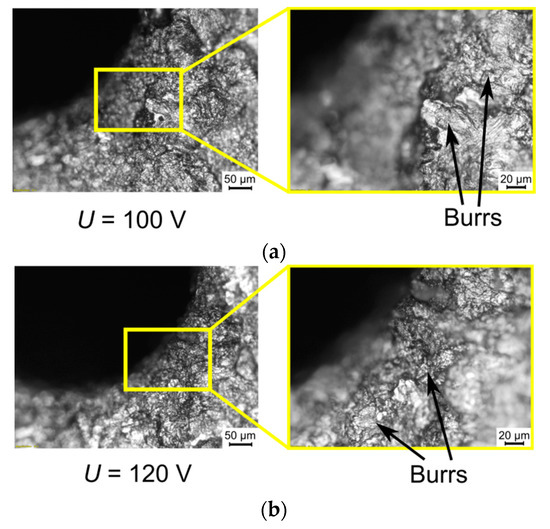 Applying a higher open voltage allows for the faster heating of deionized water during the ignition delay time, which increases the electrical conductivity of the deionized water. For this reason, during td, electrochemical dissolution can be enhanced and significantly influence the process. The presence of electrochemical dissolution in the single impulse improves the efficiency of the EDM process, particularly for obtaining higher values of the drilling speed and higher values of the aspect ratio hole (for applied U = 100 V: v = 5.33 µm/s, AR = 17 and for applied U = 120 V: v = 7.00 µm/s, AR = 16). In addition, the dimensional accuracy of the obtained holes is also improved by an excessive electrochemical dissolution. The values of the side gap thickness are 130–160 µm and the edges of the entrance diameter are characterized by a small number of burrs (Figure 11); however, for the test applying U = 120 V, the burrs that formed are smaller and smoother in comparison to the test applying U = 100 V, which is the result of the reinforced electrochemical reaction improving accuracy (Figure 12a,b).