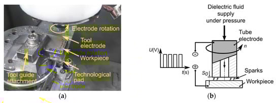 The following constant parameters were assumed: initial interelectrode gap thickness (S0 = 50 μm), drilling time of each hole (tdrilling = 45 min or shorter in the case if through hole was obtained faster), pulse off time (toff = ton), and deionized water as the dielectric fluid (with the electrical conductivity in the range 1.00–8.5 µS/cm). The experimental setup is presented in Figure 4a. The dielectric fluid was flushed down to the gap zone through the interior hole of the tube (Figure 4b).