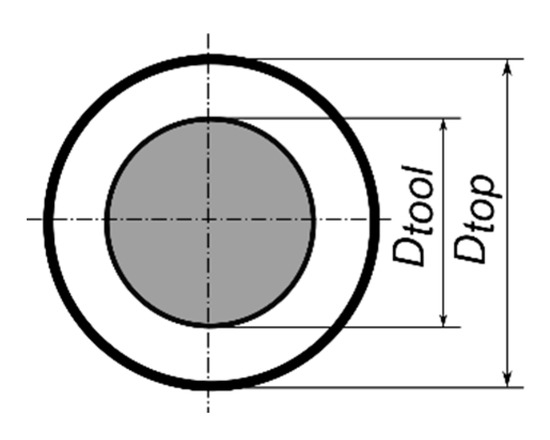 where Daverage = (Dtop + Dbottom)/2 is the average of the hole diameters, Dtop is the average top diameter, and Dbottom is the average bottom diameter. In case a hole was not obtained, Dbottom equals the outer diameter of the tool electrode. The values of Dtop and Dbottom are the mean values from 10 measurements. Measurements of the diameters were performed with the use of the K-401 stereo microscope with a common main objective (CMO) Infinity optical system (Motic, Richmond, BC, Canada) and equipped with a Moticam 2300 digital camera with the MoticImages Plus system (Motic, Richmond, BC, Canada).