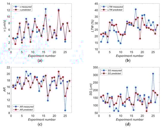 The result of the F statistic indicates for the whole of the developed regression models that the p-values are less than 0.05 (i.e., 95% of the confidence level), which confirms that the models obtained are statistically significant. Comparisons between the results of experimental studies and the values calculated based on the developed regression models for v, LTW, AR, and SG are presented in Figure 6a–d.