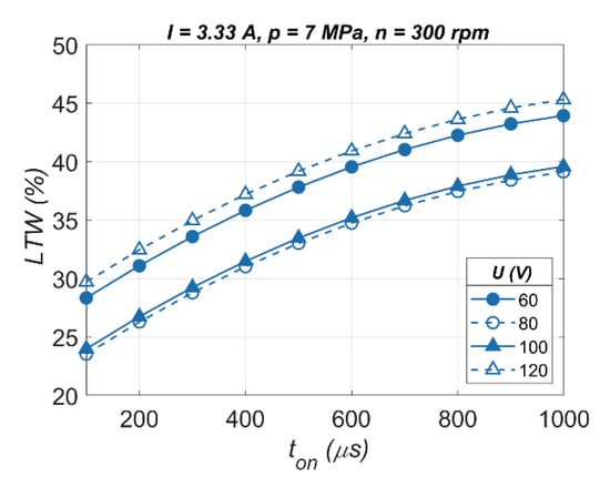 In the case of a lower value of U and lower values of I, the amount of energy of the electrical discharges can be too small to remove sufficient material. The low thermal conductivity of Inconel 718 can prevent the sufficient heating of the machined surface, which causes melting and re-solidifying material. Figure 8 shows the pulse time duration and the increase in LTW; a longer impulse time results in a longer electrical discharge time (arc discharges/short circuits for U = 60 V) in a single pulse.
