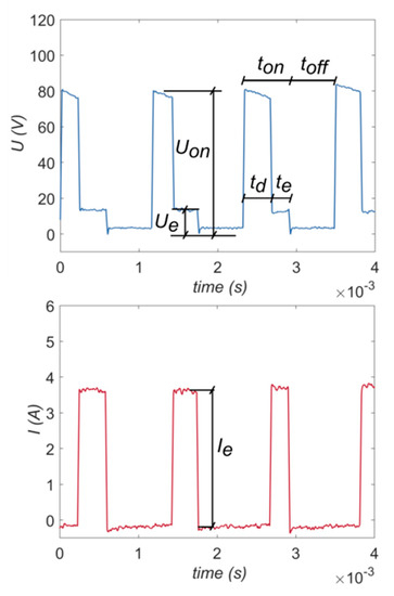 Figure 9 shows typical current and voltage waveforms registered for the investigation of EDM with the use of deionized water as a dielectric fluid. During the EDM process, while the supply voltage Uon drops to the discharge voltage Ue, there is an increase in the discharge current Ie during the pulse time ton.