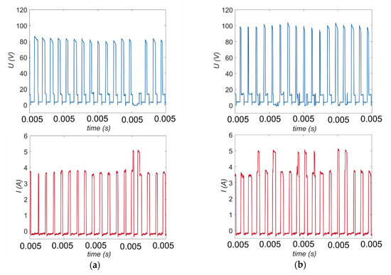 The recorded voltage and current waveforms for the following process parameters: (a) U = 60 V, ton = 550 µs, I = 3.33 A, p = 7 MPa, n = 300 rpm; (b) U = 100 V, ton = 550 µs, I = 2.00 A, p = 7 MPa, n = 300 rpm.
