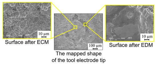 The recorded current and voltage waveforms showed that the current amplitude during the time test increased from 0.04 to 0.4 A. This indicated the increase in electrical conductivity of the deionized water by heating. At the end of the test, the temperature of the deionized water was so high that it caused conditions to occur such that electrical discharge resulted in the interelectrode gap area. Figure 13 shows images taken via an electron microscope (SEM) (manufactured by JEOL Ltd. (Tokyo, Japan)). Figure 13 shows a trace mapping of the tool electrode tip and the surfaces after the ECM and EDM processes.