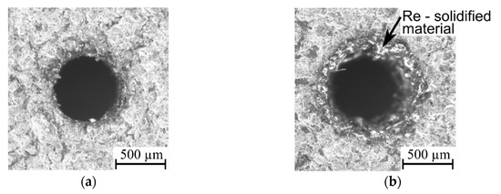 In the EDD process, the amount of heat delivered to the workpiece material and into the material structure affects the removal process. The low thermal conductivity of the Inconel 718 superalloy and its increase with the increase in temperature leads to a decrease in the accuracy of drilling holes. When a lower current amplitude is applied (I = 2.66 A) and a similarly appropriate pulse time duration (ton = 775 µs), a significant amount of re-solidified material occurs on the edge of the hole entrance (Figure 13b). This is the result of the heating of a greater area of material by extending the pulse time of a single pulse, and the energy delivered to the workpiece material is too small to remove material due to the lower current amplitude; however, the application of a longer pulse time, ton = 550−999 µs, in combination with a higher current amplitude, I = 3.99−4.65 A, affects the improvement in the hole accuracy (obtained values of SG ≤ 100 µm) (Figure 14b); re-solidified material is absent in this case. Usually, using the longer pulse time worsens the homogeneity of the edge of the entrance to the hole and the accuracy of holes drilled by using the EDD process. In the case of applying the Inconel 718 superalloy as a workpiece material, using longer pulse times and higher current amplitudes is favorable.