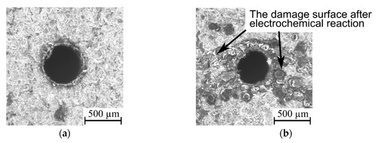 The higher current amplitude also caused faster heating of the deionized water in the gap area and significantly increased its electrical conductivity. The higher electrical conductivity of the deionized water reinforced the electrochemical dissolution during the EDM process. Serious damage on the surface around the top diameter is seen in Figure 15b; however, an excessive electrochemical dissolution increases the process efficiency. The obtained drilling speed for this test is the highest value (v = 12.32 µm/s) in comparison to other tests; the aspect ratio hole is also high for this drilling test (AR = 19).