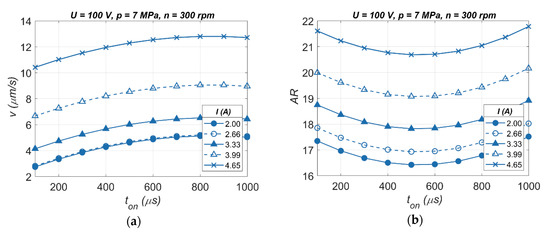 The impact of various values of the current amplitude on: (a) the drilling speed v; (b) the hole’s aspect ratio AR.