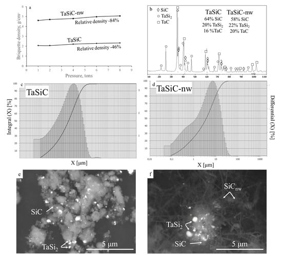 The synthesized compositions, TaSiC and TaSiC-nw (Figure 1), were characterized by a similar phase composition (Figure 1b) and size distribution of composite powders after the combustion synthesis and ball milling (Figure 1c,d). Figure 1b provides the XRD spectrum for the TaSiC powders (phase composition 64 wt % SiC, 20 wt % TaSi2, 16 wt % TaC); the spectrum for TaSiC-nw powder (phase composition 58 wt % SiC, 22 wt % TaSi2, 20 wt % TaC) was similar, with slightly higher intensity of TaC peaks and lower intensity of TaSi2 peaks. The mean particle size of 8 and 6 µm was attained for TaSiC and TaSiC-nw compositions, respectively. Microstructure-wise, both TaSiC and TaSiC-nw powders were heterogeneous, i.e., every powder particle consisted of submicron-sized grains of TaSi2 and SiC (Figure 1e,f). In the case of TaSiC-nw composition, heterogeneous composite particles were surrounded by 5–10 µm long SiC nanowires. The mechanism of nanowire growth in this system was reported earlier [14,56].
