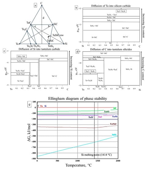 Ab initio calculated isothermal section (0 K) of Ta-Si-C phase diagram (a); Grand potential phase diagrams assuming Ta (b), Si (c), and C (d) as an open element/principal diffusor; (e) Ellingham diagram of phase stability in the Ta-Si-C system.