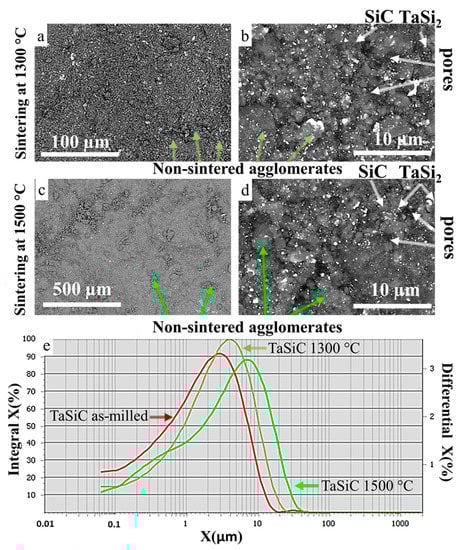 SEM images of TaSiC powders. (a,b) Sintered at 1300 °C; (c,d) Sintered at 1500 °C; (e) Histograms with the agglomerate size in the TaSiC samples before sintering and after sintering at 1300 and 1500 °C.