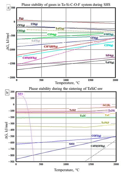 Since the TaSiC-nw powders possessed remarkable compressibility which implies the presence of some form of fluorinated carbon, let us consider the phase equilibria of gaseous species during the combustion synthesis in the Ta-Si-C-O-F system (Figure 4a). The calculations of phase stability of gaseous species forming upon the decomposition of C2F4 in the presence of tantalum, silicon, and oxygen suggest that the most thermodynamically stable reaction products are TaF5, SiF4, and C4F8, which is consistent with previous experimental reports on the thermolysis of polytetrafluorethylene (C2F4) in vacuum and in the presence of oxygen [76,77,78,79]. The decomposition of C2F4 in the air was associated with the formation of CO2, CO, and COF2. The SiF4 and TaF5 phases are known to be the most stable fluorides of Si and Ta [80,81]. The melting and evaporation of TaF5 occurred at 95 and 229 °C, respectively. TaF5 can react with silicon (Equations (17) and (18)), tantalum disilicide (Euaqtion (19)), and silicon carbide (Equation (20)), but does not react with TaC. The reactions between TaF5 and Si, as well as TaF5 and TaSi2, are thermodynamically favorable in the whole analyzed temperature interval (T = 25–2000 °C). Interestingly, the reaction of TaF5 with SiC does not occur at temperatures below 390 °C; however, at higher temperatures, the ΔG of the reaction decreases drastically (−991 kJ/mol at 400 °C, −1979 kJ/mol at 1000 °C) and surpasses Equations (17)–(19). Therefore, Equations (17)–(19) are likely to occur at temperatures below 400 °C, whereas at higher temperatures Equation (20) is predominant.