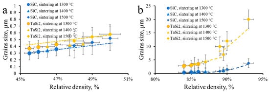 Grain size versus relative density curves. (a) For TaSiC composition; (b) For TaSiC-nw composition.