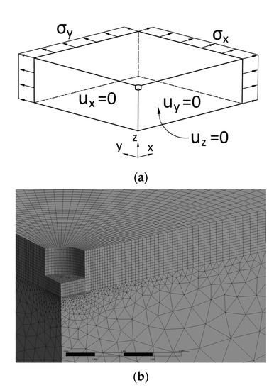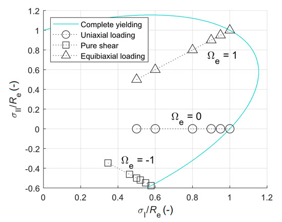 where is the applied equivalent stress according to von Mises yield criterion (stresses in two directions were actually applied in the FEM model). The used combinations of with , where and are the principal stresses in and principal directions, respectively, and biaxiality ratios are shown in Figure 4.