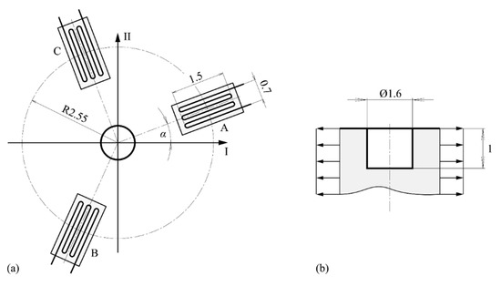 The strains were obtained from the virtual strain gauge rosette by averaging of the nodal strains across the strain gauge grid surface at stepwise removal of the hole layers. Dimensions, designations and orientations of the strain gauge rosette according to the directions of applied load are depicted in Figure 3a. The dimensions of the drilled hole are given in Figure 3b.