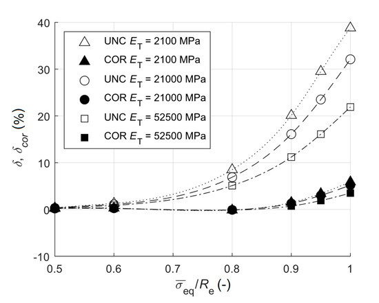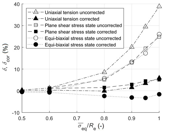 The comparison of errors for all stress states with MPa is shown in Figure 10. Errors of uncorrected equivalent stresses are higher for uniaxial tension than for the plane shear or equi-biaxial stress state. On the contrary, errors of corrected equivalent stresses were higher for the equi-biaxial stress state and the plane shear stress state, when compared to uniaxial tension. Therefore, the plasticity correction for the equi-biaxial stress state and the plane shear stress state was less successful than in the case of uniaxial tension, except in the case where . Despite that, the errors of corrected equivalent stresses were very low.