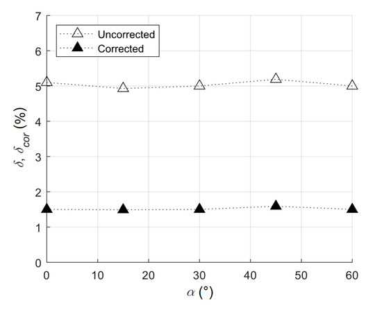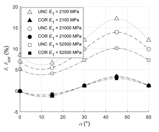 The error due to the failure in orienting the strain gauge rosette within the principal directions caused the increase of the relative error for uncorrected stresses as well as corrected ones (Table 2 and Figure 6). This increase was more than double for uncorrected stresses (compared to the corrected ones) and respective errors were high.