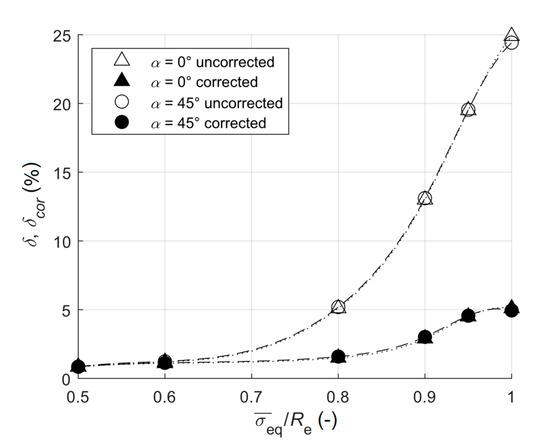 The relative error of evaluated equivalent stress can be expressed as a ratio of an absolute error of this stress and a real (true) value of equivalent stress (the applied one). It is in percent for uncorrected stresses as