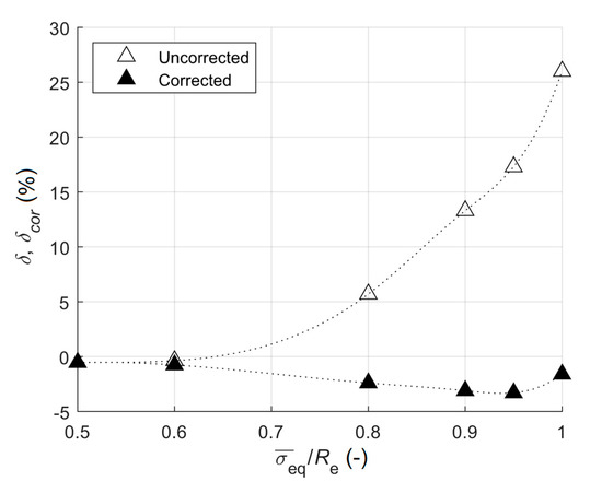 The errors of uncorrected equivalent stresses were lower for the plane shear stress state, when compared to uniaxial tension. These differences increased with the increasing magnitude of the residual stress (Figure 7). On the contrary, the errors of corrected equivalent stresses were higher for the plane shear stress state, when compared to uniaxial tension. Therefore, the plasticity correction was less efficient at the plane shear stress state than that at uniaxial tension. However, the errors were still acceptable (Figure 7).
