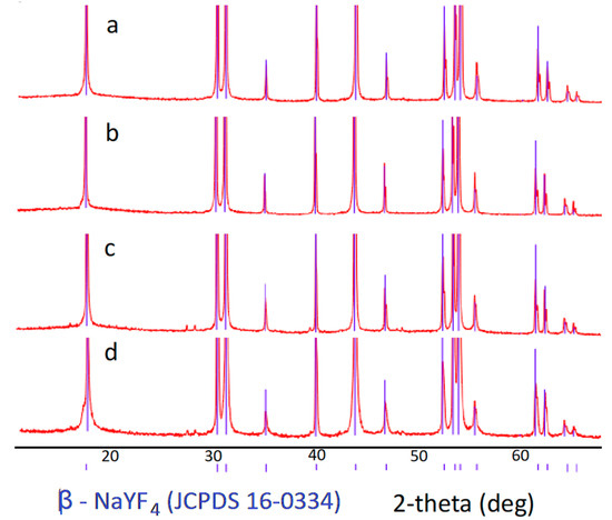 NaYF4 exists in two phases [5,26,27,28]: cubic α-NaYF4 phase and hexagonal β-NaYF4 phase. The upconverting efficiency of the hexagonal phase NaYF4: Yb,Tm/Er materials are significantly higher [19,29,30]. X-ray powder diffraction (XRD) patterns of the synthesized samples are given in Figure 1.