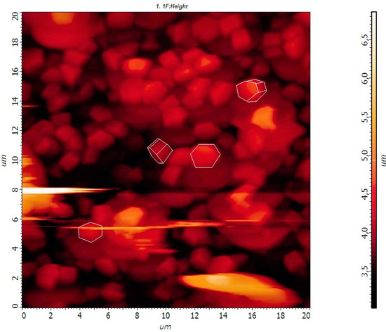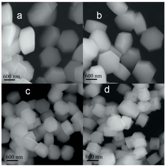 All the samples consisted of sub-micron-sized uniform hexagonal prism-shaped particles (Figure 2a–d). The morphology of the microcrystals obtained by SEM agreed with that obtained by AFM (Figure 3).