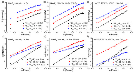 To study the mechanism of upconversion processes in NaYF4: Yb, Er, Gd and NaYF4: Yb, Tm, Gd phosphors, we measured the emission intensity dependence on pump power. The upconversion emission intensity (IUC) increased proportionally to the pumping power (p) of the excitation source according to IUC–Pn, where n is the number of photons that pump the population in a particular energy level [26,36]. Therefore, n, the number of photons involved in the upconversion emission, can be obtained from the logarithmic plot of the integral emission intensity vs. the incident laser power. Figure 6a–c show the plot of the integral emission intensity of the green and red emission lines as a function of the pump laser power for NaYF4: Yb, Er, Gd powders.