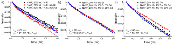 To provide a more detailed study of the Gd3+ co-doping effect on luminescence properties of NaYF4: Yb, Er, Gd and NaYF4: Yb, Tm, and Gd powders, we carried out kinetics measurements. Decay curves of NaYF4: 20% Yb, 1% Er/1% Tm (without Gd3+ co-doping); NaYF4: 20% Yb, 1% Er/1% Tm, 5% Gd (the most prominent sample); and NaYF4: 20% Yb, 1% Er/1% Tm, 20% Gd (highly Gd3+ co-doped sample) were recorded (Figure 8).
