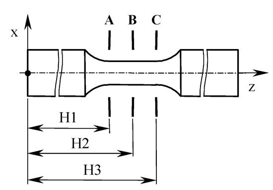 Designation of the cross-sections in which the diameter values were measured. The distance of the given cross-section (A, B, C) from the sample base was: H1 = 40 mm, H2 = 43 mm, H3 = 46 mm.