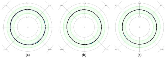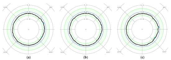 The measurements results example of the roundness of a specimen made using the DMLS method in cross-section: (a) A-A; (b) B-B; and (c) C-C.