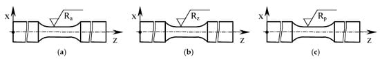 In accordance with the recommendations and requirements of [28] standard, the following roughness parameters were determined: Ra, Rz, and Rp. The tests were carried out on the measuring part of the sample, as shown in Figure 8.
