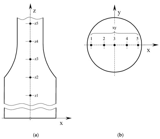 Hardness measurement method: (a) schematic designation of hardness measuring points along the z-axis; and (b) schematic designation of hardness measurement points in the shank on the x–y-plane.