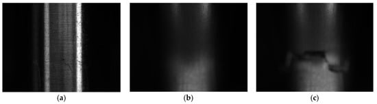 Pictures of a DMLS specimen taken with the BASLER acA4024-8gm camera during a static tensile test: (a) before starting the test (reference image); (b) just before the sample breaks and (c) just after breaking up.