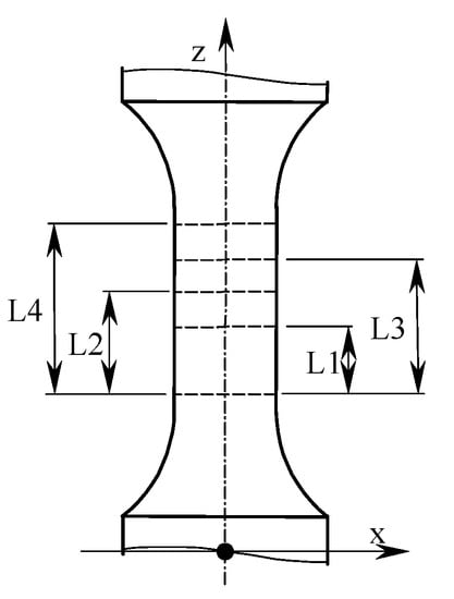 Schematic presentation of the areas analyzed using the digital image correlation method, for which the measuring ranges were: L1 = 1.36 mm, L2 = 2.72 mm, L3 = 3.49 mm, and L4 = 10 mm (measured with an extensometer).