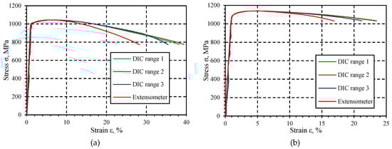 Figure 12 schematically shows the area on the sample subject to displacement analysis, which was divided into three ranges. The selected strength parameter values obtained for DMLS samples are presented in Table 6, while the results for specimens produced of drawn bar are given in Table 7. Table 6 and Table 7 summarize the values obtained on the basis of deformation measurements made with an extensometer and using digital image correlation for various measuring ranges. The extensometer measuring range was L4 = 10 mm, while the measuring ranges for the digital image correlation method were: L1 = 1.36 mm, L2 = 2.72 mm, and L3 = 3.49 mm. Figure 13 shows examples of tensile charts determined using an extensometer and digital image correlation for samples made with DMLS additive manufacturing technology (Figure 13a) and from a drawn bar by turning (Figure 13b).