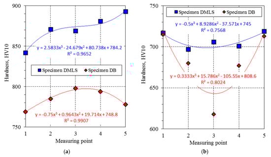 Figure 14b shows the hardness measuring results of the DMLS and DB samples taken on the x–y-plane according to the diagram in Figure 9b. The hardness results for both DMLS and DB specimens were lower than those achieved along the z-axis. On the x-plane, higher hardness values were gained for the DMLS specimen, which were in the range of 697–719 HV10. On the other hand, the DB sample had a hardness of 618–715 HV10. The DB sample was characterized by the highest hardness around the section edge Point 1, 715 HV10; Point 5, 713 HV10). As the DB sample axis approaches, a decrease in hardness can be seen (Point 3, 618 HV10). Such hardness distribution may be affected by the deformations value resulting from the stretching of the material outer layers. It is known that a rod with a round section loaded with tensile force has a variable distribution of deformations in the cross section. Therefore, in each of the analyzed cases, the hardness outside the sample is the highest. In the case of DB samples, this difference may be due to the producing method of the bar, i.e., pulling process. The obtained results were described by the polynomial equation shown in Figure 14b, which does not describe their variability very accurately, as evidenced by the determination coefficient R2 = 0.8024. In the case of results for DMLS specimen, the highest values were around the section edge (Point 1, 717 HV10; Point 5, 719 HV10). As with the DB sample, the hardness value was the highest on the outer layers of the sample. It can also be affected by deformations occurring in the material resulting from the stretching of the outer layers. Differences in hardness values in the printed sample were lower due to the layered manufacturing process. The difference between the highest and lowest hardness values for the DMLS sample was 22 HV10. The obtained test results were described by a polynomial equation (Figure 14b). The value of the coefficient of determination is R2 = 0.7568.