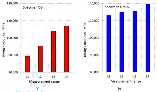 Change of Young’s modulus value depending on changes in the measurement base value for: (a) DB specimen; and (b) DMLS specimen.