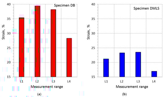 The changes results in elongation A for the adopted measuring ranges show that the lowest values were achieved for both types of samples for L4 = 10 mm (Figure 16). The smaller the measurement range, the greater the strain value. The smallest measuring range included a fragment of the sample in which there was a crack resulting from the occurrence of tensile forces. There was stress concentration at the crack site and a simultaneous increase in the deformation of the material layers. The average deformation value in areas L2 and L3 was lower than in the case of the L1 measurement range. The largest measuring range L4, obtained for the extensometer, was characterized by the lowest deformation value. Higher elongation values were obtained for DB specimens that range from 28.3% to 39.4%, while for DMLS samples from 16.9% to 23.5%.