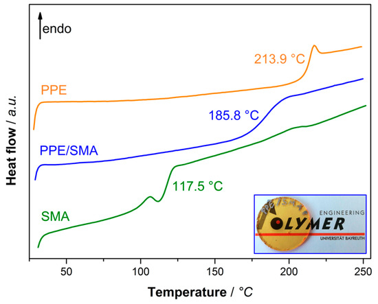 As both polymers are amorphous, only a Tg signal (no melting temperature) appears at 117.5 and 213.9 °C for SMA and PPE (Figure 1, green and orange), respectively. When PPE and SMA are mixed at a given ratio, the Tg signals coincide at 185.8 °C (Figure 1, blue). For estimation of the mixed-Tg, Fox equation (Equation (1)) will be used, where Tg (blend) is the Tg of the binary blend of PPE/SMA and w is the mass fraction of each blend partner, namely PPE and SMA.