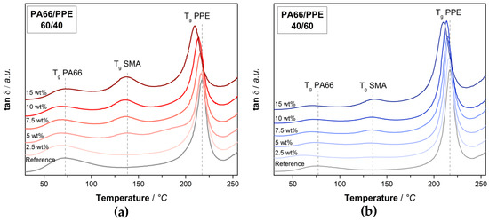 Since the SMA is first blended with PA66 in case of the ternary blends, one can expect a different interaction of the SMA with PPE. The tan δ responses for both blend ratios at varying SMA contents are depicted in Figure 2.