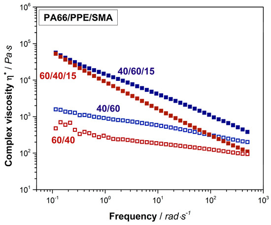 PPE as an amorphous polymer, displays a relatively high viscosity compared to the one of semi-crystalline PA66 (Figure A1). Due to this fact, the complex viscosity of the 40/60 PA66/PPE blend is higher than the 60/40 blend over the complete frequency range. The trend of both curves conforms to the ones of typical linear thermoplastic polymers, however at lower frequencies no clear plateau is seen. This might be explained by reactions between PA66 and PPE during blending, leading to block-copolymer formation. When 15 wt% SMA is added, a strong linearity for both blend ratios occurs. Crosslinked and branched polymer chain topologies are known to exhibit a linear dependency of the shear viscosity to the applied frequency [51]. To confirm this observation, storage moduli (G’) data was plotted against the frequency (Figure A3). The G’ of both blends with SMA tend to reach a plateau for low frequencies around 0.1 rad/s indicating a solid-like behavior [36], due to the graft copolymer formation between SMA and PA66 via imidization reaction. As observed for the binary blends, also with 15 wt% SMA, the 40/60 blend ratio reveals higher viscosities over the full spectrum of frequency.