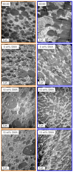 To gain a deeper understanding about the apparent morphologies, TEM images of the 60/40 and 40/60 blends with SMA contents of 0, 5, 10 and 15 wt% are given in Figure 4. The dark areas represent the PPE phase which was selectively stained prior the microscopy.